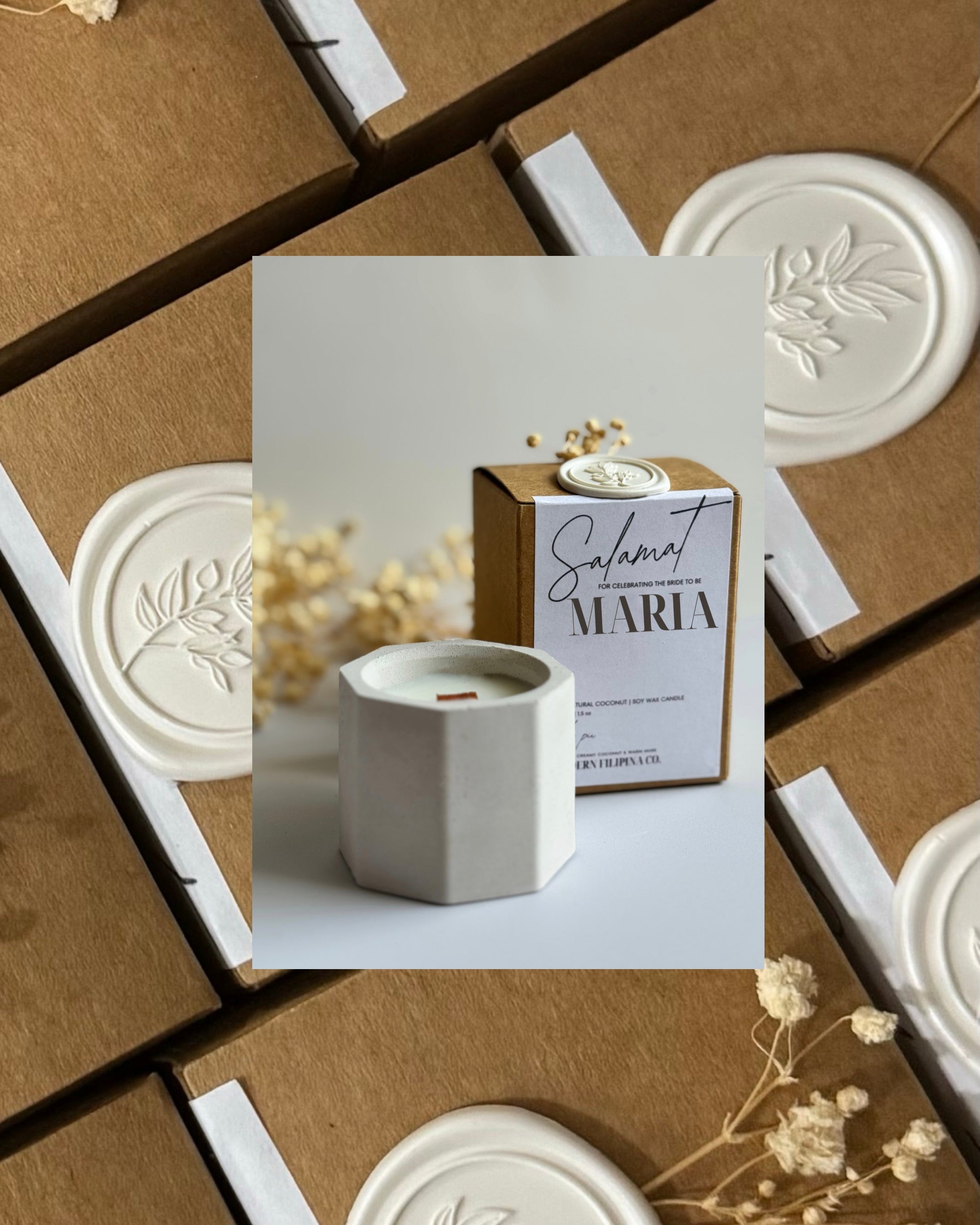 If you’re looking to purchase in bulk for a special event, please send us a message to inquire about pricing. We offer custom candles and trays for gifts and party favors! Custom labels are available as well. Contact us at customerservice@modernfilipinaco.com — We’d love to work with you on your next event!